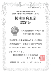 令和6年10月1日付で昨年に引き続き健康保険組合連合会より「銀の認定」を取得いたしました。これからも健康づくり活動を今後も継続/発展し、従業員の健康増進及び健康経営に努めてまいります。