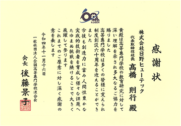 全国高等専門学校連合会より表彰されました 2023.01.18 最終更新日時 : 2024.09.03 admin 1月18日(水)石川工業高等専門学校において、高専制度創立60周年記念事業の一環として感謝状贈呈式が開催され、弊社は長年にわたる高専生への積極的な採用活動が功績として認められ全国高等専門学校連合会より感謝状を頂きました。