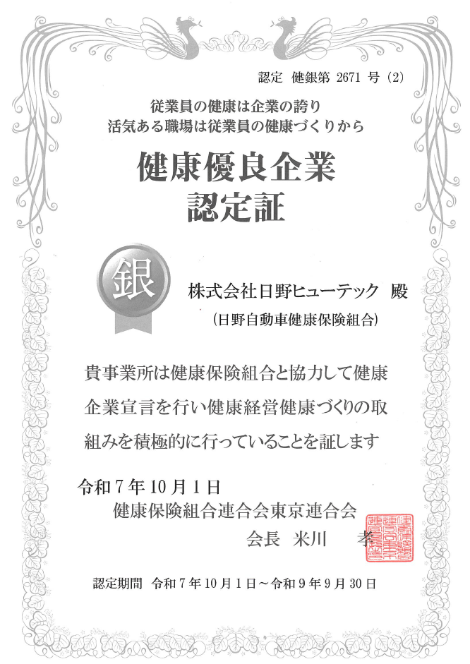 健康優良企業「銀の認定」を取得 2025.11.12 最終更新日時 : 2025.11.12 齋五澤良太 令和7年10月1日付で昨年に引き続き健康保険組合連合会より「銀の認定」を取得いたしました。これからも健康づくり活動を今後も継続/発展し、従業員の健康増進及び健康経営に努めてまいります。